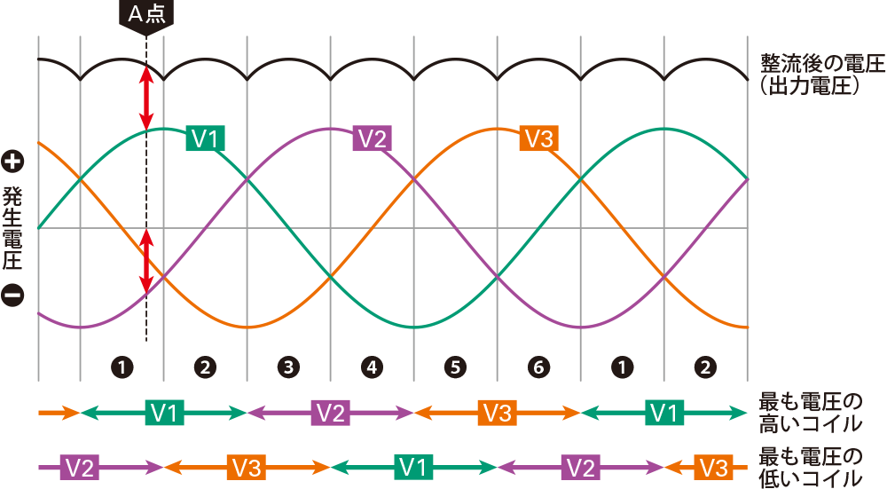 下図は、3つのステーターコイルで発生した位相が120°ずつずれた三相交流の電圧波形と、整流後の出力波形、ならびに回路の電気の流れを示したものです。